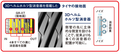 タイヤと路面が接地することにより発生する振動は、音となって車内まで伝わります。GR-XTは、3Dノイズカットデザインを採用することで、その振動を車内に伝わりにくくし、ロードノイズ