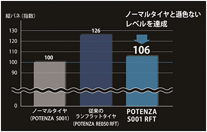 (1)「熱をコントロールする技術」として、「新サイド補強ゴム」「クーリングフィン™」を採用し、「POTENZA S001」(ノーマルタイヤ)と比べても遜色ない乗り心地を実現しました。