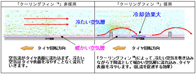 「クーリングフィン™」は、タイヤサイド部の表面に設けたタイヤ径方向に延びる突起により、空気の乱流を促進してタイヤを冷却する技術です。