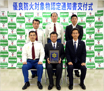 門倉徹 麻布消防署長(前列左)と滝田久人 当社人事部長(前列中央)