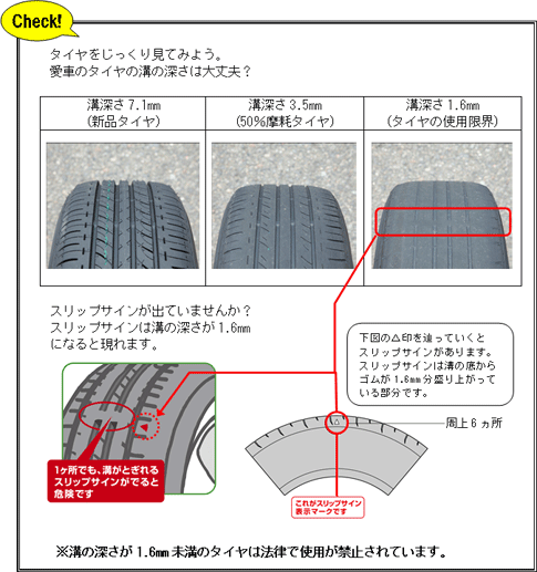 詳しいタイヤ点検の方法や、タイヤの安全についてはこちらまで。