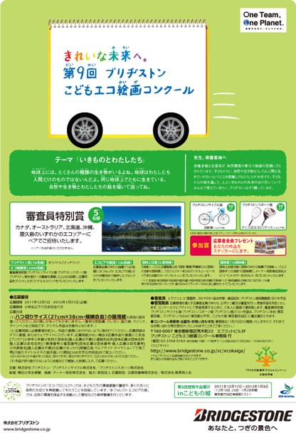株式会社ブリヂストン(社長 荒川詔四)は、ブリヂストンサイクル株式会社(社長 竹内雄二)及びブリヂストンスポーツ株式会社(社長 福岡杉夫)と共同で、「第9回ブリヂストン こどもエコ絵画コンクール」を開催いたします。応募期間は2011年12月1日(木)から2012年1月31日(火)までです。