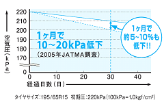 ゴムは空気を通さないと思われがちですが、空気はゴム分子の隙間を通って、少しずつ漏れていきます。これでタイヤの空気圧は1ヶ月に約10~20kPa抜けてしまいます。