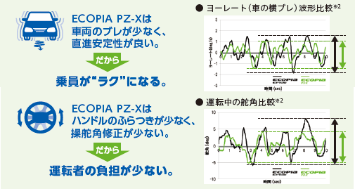 今回発売する3商品は、当社の材料技術「NanoPro-Tech(ナノプロ・テック)」※2 の採用などにより、「ECOPIA PZ-X」では、当社従来品「Playz PZ-X」対比転がり抵抗を37%低減。他の2商品でも、当社従来品対比で転がり抵抗を低減しており、全95サイズ中33サイズで低燃費性能の最高グレード「AAA」を達成しています。また、低燃費性能だけではなく、当社従来品「Playz PZ-X」等に採用している非対称形状を採用することで、直進安定性を高め、運転中の"ラク"を追求しています。さらに、セダン・クーペ、軽・コンパクトカー、ミニバンそれぞれの車種特性に合わせた専用設計を行うことで、新たな付加価値も追求しています。