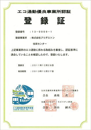 株式会社ブリヂストン(社長 荒川詔四)の技術センター並びに東京工場は、「エコ通勤」の推進に向けた活動や取り組みに対する意識を評価され、国土交通省などにより構成される「公共交通利用推進等マネジメント協議会」※1より、「エコ通勤優良事業所」として認証を受けました。「エコ通勤」とは、従業員の通勤手段が、車から電車やバス・自転車・徒歩などに、自発的に転換することを促す、事業所主体のさまざまな取り組みのことです。
