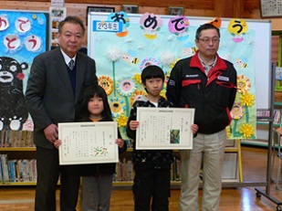 今回は、より多くの子どもたちに当コンクールにご参加頂くことを目的に、近隣の小学校を対象に「熊本工場長賞」として4名、「団体賞」として1校を決定しました。3月14日(水)に受賞者及び受賞校の表彰を行いました。また、「熊本工場長賞」には副賞として、作品をプリントした掛け時計を贈呈しました。