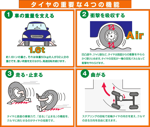 タイヤは唯一、路面と接しているクルマの部品であり、クルマにとって必要不可欠な存在です。しかも路面と接しているのはタイヤ1本あたりわずかハガキ一枚程度の面積です。そのわずかな接地面で自動車の「重量を支え」「走る・止まる」「曲がる」さらには「乗り心地をよくする」機能も担っています。自動車がその性能を十分に発揮するために、タイヤが果たしている役割は非常に大きいのです。