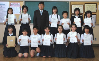 より多くの子どもたちに当コンクールへご参加頂くことを目的に、防府工場は日頃からおつきあいのある近隣の小学校及び幼稚園を対象に、「防府工場長賞」と「防府工場賞」を独自に設けています。今回は「防府工場長賞」5作品、「防府工場賞」22作品の受賞を決定し、5月2日(水)に中関小学校で受賞者の表彰を行いました。なお、中関幼稚園と西浦幼稚園でも今後表彰を行う予定です。