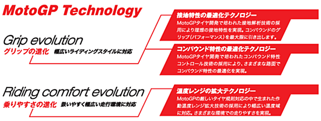 MotoGPテクノロジー(走行時の接地特性最適化)に基づき、構造を最適化。柔構造化により、高い旋回性能とウォームアップ性能を追求。