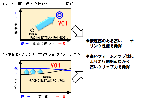『RACING BATTLAX V01』は、モーターサイクルレースに参加するお客様向けに開発した商品で、「BATTLAX」シリーズのフラグシップモデルです。 今回発売する商品は、MotoGPテクノロジーによる解析技術を採用。タイヤの構造と形状を最適化することにより、ウォームアップ性能と旋回性、操安性を高めました。これにより、走行開始直後から安定した走行が可能となり、サーキット走行において高いパフォーマンスを発揮します。