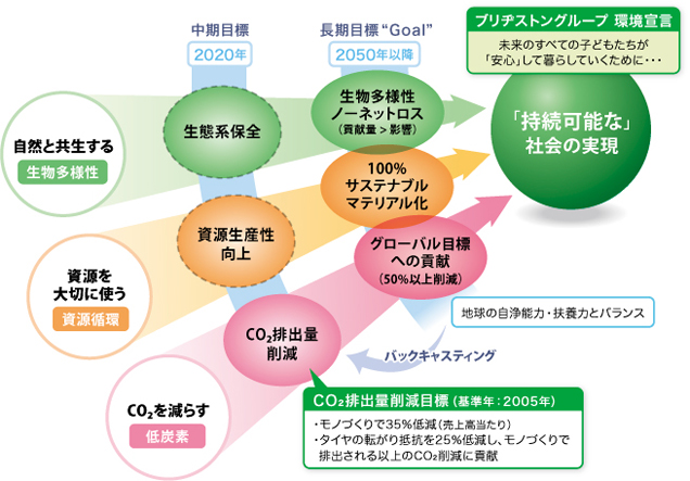 ![]() | ブリヂストンが世界共通の環境メッセージとして掲げた「One Team, One Planet」。 その意志は、グローバルに展開する一企業として、またその枠をこえてあらゆる人々と、地球のために、ひとつになること。 未来のすべての子どもたちが「安心」して暮らしていくために。 |