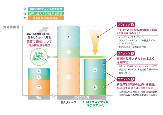 このような考え方の下、「持続可能な」社会を実現する上で、当社グループは環境長期目標(下記1項参照)を策定し、その中でも当社の技術力、開発力を大いに活かすことができる独自の取り組みとして、特に「100%サステナブルマテリアル化」を重要な目標として位置付けています。その達成には技術の進化が必要不可欠ですが、特に新たに求められる技術は「再生可能資源の多様化・拡充」に寄与するものです。具体的には「新しい再生可能資源に『拡げる』」取り組みとして、「天然ゴム生産地域の多様化」に加え、「植物由来補強繊維の多様化・拡充」を図ります。また、「化石資源を再生可能資源に『換える』」取り組みとして、「バイオマス由来合成ゴムの開発」、「バイオマス由来カーボンブラックの開発」、「バイオマス由来新規ゴム配合剤の開発」等に取り組んでいきます。当社グループは2050年に向けてこれらの技術開発を追求し、その開発状況について随時発表してまいります。