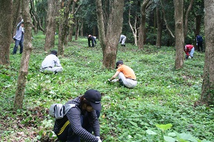 2010年5月に「B・フォレスト エコピアの森 下関」の開所式と森林整備活動を実施し、2011年2月と5月に森林の恵みを実感する森林ふれあい体験学習※2を行いました。今回は4回目の活動となり、総勢122 名の参加者と下草刈りや子どもたちを対象とした竹細工体験を行いました。