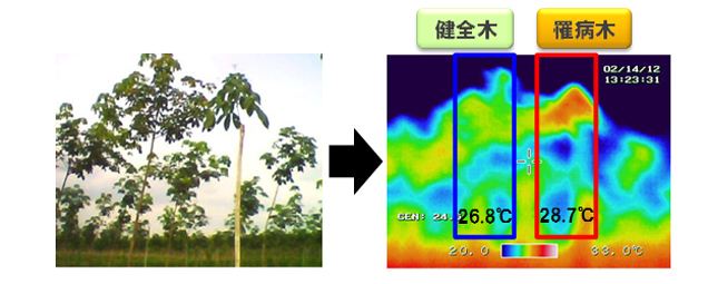当社は、世界の「パラゴムノキ」の栽培面積の9割以上を占める東南アジアにおいて、「パラゴムノキ」の根白腐病※3の被害が深刻化していることに着目。現在、根白腐病の診断は目視で行われているため、検出精度が低く、発見の遅れや誤診などにより病害を蔓延させる原因になっています。そこで、2010年よりNEDO研究協力事業の中でインドネシア技術評価応用庁、ボゴール農業大学、東京農業大学、東京農工大学、九州大学と連携し、「パラゴムノキ」の病害診断・防除技術の開発を進めてまいりました。
