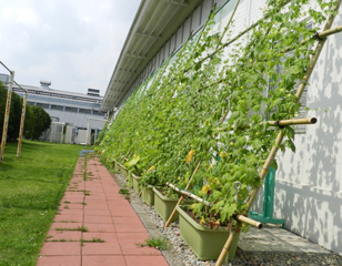 ※1:グリーンカーテンとは、建屋の側面につる性の植物を育て、カーテンのように覆うことです。周りの気温を下げる効果や、日陰を作る事で温度上昇を抑える効果があります。