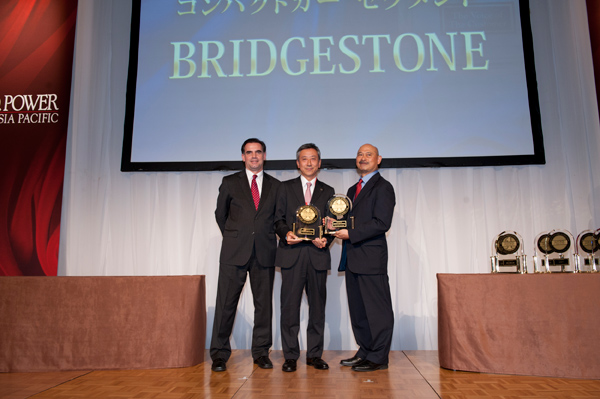 株式会社ブリヂストンは、J.D. パワー アジア・パシフィックが行った2012年日本OEタイヤ顧客満足度調査SMの軽自動車およびコンパクトカーの2セグメントにおいて第1位となり、11月6日に東京都中央区で開催された「J.D. Power Automotive Awards 2012」において表彰されました。なお、各セグメント第1位は、それぞれ3年連続、6年連続となりました。