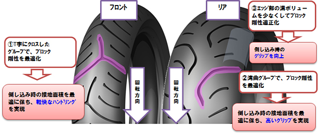 「新パタン」採用により高いハンドリング性能とグリップ性能を発揮します。