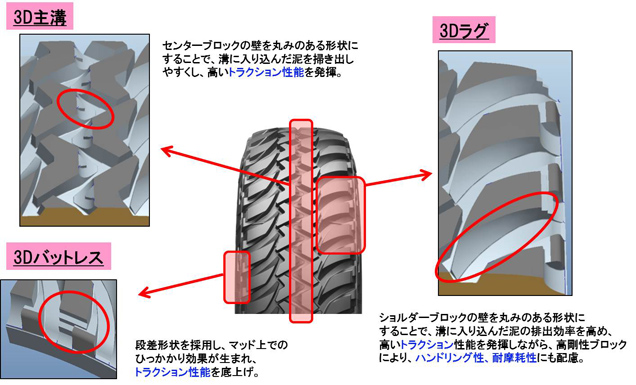 3D形状の新パタン採用により、マッド上のトラクション、ハンドリング性能を追求。