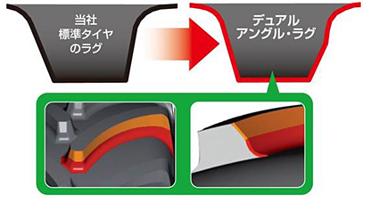 ラグに2段階の角度をつけることにより、走行時に土を捉える面積が拡大し、けん引力(トラクション)性能と排土性(走行時に土を蹴る面積)を向上。