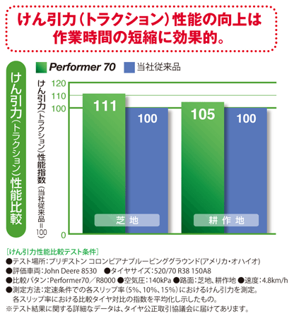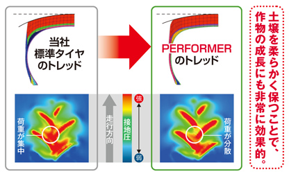 「PERFORMER」は、新パタンの採用により、優れたけん引力、偏摩耗の抑制、そして土壌への優しさを追求しながら、農業トラクターの大型化、ハイパワー化に対応します。