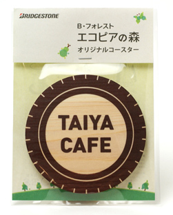 株式会社ブリヂストンは、「B・フォレスト エコピアの森」プロジェクト※1の森林整備活動で森林の手入れによって切り出されたひのきの間伐材※2を有効活用した'コースター'を、ノベルティグッズ(非売品)として製作しました。この「B・フォレスト エコピアの森 コースター」は、今まで製作した'ひのきブロック'、'しおり'に次ぐ、ノベルティグッズ第3弾で、当社テレビCMなどでおなじみの「TAIYA CAFE」をモチーフにデザインしたものです。