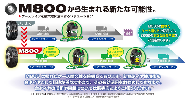 当社は、輸送事業者様の課題解決に貢献すべく、「新品タイヤ+リトレッドタイヤ+タイヤメンテナンス」を組み合わせた「エコバリューパック」を展開しており、既に多くのお客様よりご好評をいただいています。2回リトレッドを追求した「M800」と「エコバリューパック」を合わせてご活用いただくことで、これまで以上にお客様の環境経営と経費削減に貢献ができるものと考えております。