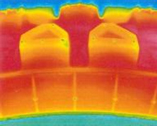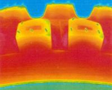 | 表面温度状態 (室内試験機にてタイヤを回転させてサーモカメラで撮影したものです。 赤色の箇所がより温度が高い部分です。) |