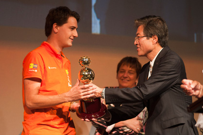 株式会社ブリヂストンが冠スポンサーとして協賛する「ブリヂストン ワールド ソーラー チャレンジ 2013」の表彰式が、10月13日、オーストラリアのアデレードにて行われました。優勝したチームには、当社のグループ・グローバルマーケティング戦略・モータースポーツ担当フェローである牛窪寿夫よりトロフィーが贈呈されました。