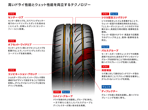 今回発売する「Adrenalin RE002」は高いブロック剛性と排水性の両立を図ったパタン及びシリカ配合コンパウンドを採用することで、高速走行時から通常の街乗りに至るまで軽快なドライハンドリング性能と高いウェット性能を実現したスポーティータイヤです。「Adrenalin RE002」は、既にヨーロッパやアジアなど世界の多くの地域でも発売されており、世界の多くの国々でも高い評価をいただいています。