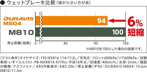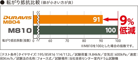 この商品は、従来品(V-STEEL MIX M810、以下同様)と比較してトレッド幅を広くし、パタンの各ブロックの剛性を高めることで、従来品対比で摩耗ライフ10%向上※1及びウェット路面でのブレーキ停止距離6%短縮※1を実現しました。また、ビード部分からタイヤサイド部分までの構造を最適化する新技術「E・Sビード構造」※2の採用やタイヤ全体の形状を最適化することで、タイヤが転がる時に発生するエネルギーロスを軽減させ、従来品対比で転がり抵抗を9%低減※1させることに成功しました。この商品を通じて、お客様の経費削減と雨の日のより安全な走行に貢献します。