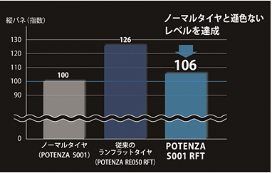 また、今回新車装着される「POTENZA S001 RFT」は、空気圧が失われた状態でもタイヤ自体が車輌を支えられるように、タイヤ側面部のサイドウォールを強化したサイド補強型ランフラットタイヤです。パンク時のたわみによるサイド部の発熱を抑える技術である「新サイド補強ゴム」や「クーリングフィン」を採用することで、ランフラット耐久性能(タイヤ内の空気が失われた後での耐久性)を維持しつつ、ノーマルタイヤと比べても遜色ない乗り心地を実現しています。