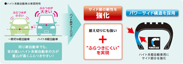 ○「ハイト系」軽自動車専用設計 背の高い軽自動車でもふらつきにくく、偏摩耗を抑制