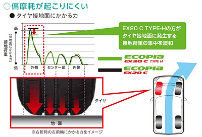 今回発売する「ECOPIA EX20C TYPE H」は、ハイト系軽自動車の「車両挙動の傾向」と「お客様の用途」にあわせ、新たに専用開発した「パワーサイド構造」を採用、サイド部の剛性を強化することで、街乗りから高速走行時まで、さまざまな場面で車両の"ふらつき"を抑制します。また街中での小回りや据え切りによる偏った摩耗を抑えることで、タイヤを長くご使用頂くことも追求しています。さらに、当社独自の新タイヤ開発技術「ULTIMAT(アルティメット) EYE(アイ)」※4を用いることで、相反する性能である低燃費性能と、ウェット性能(濡れた路面での滑りにくさ)を高次元で両立しています。