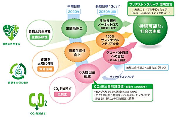 - ※1ブリヂストングループは、2012年4月に、持続可能な社会の実現に向け、「自然と共生する」「資源を大切に使う」「CO2を減らす」という「環境宣言」で掲げた3つの活動について、2050年を見据えた環境長期目標を策定しました。