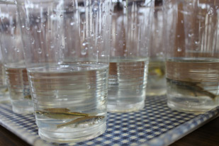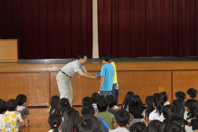 これは、2011年より「びわ湖生命(いのち)の水プロジェクト※2」において当社と共同研究している三重大学の研究員(リサーチフェロー)の鈴木規慈(すずきのりやす)氏からの提案に応じたものです。カワバタモロコの贈呈は全校生徒が集まった「ビオトープの集い」で行われ、6年生の児童の手により同校のビオトープに放流されました。
