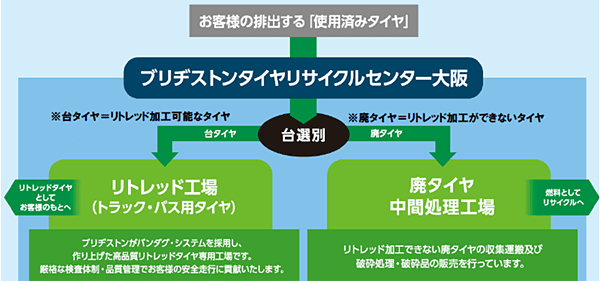 - ・当社グループは、こうした資源の有効活用をさらに推進するために、2013年7月にリトレッドタイヤ製造工場と廃タイヤ中間処理※6工場を集約し、2015年7月以降はブリヂストンタイヤリサイクルセンター大阪株式会社において、使用済みタイヤのリユース・リサイクルを推進しています。
