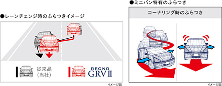 「レグノミニバン用サイドチューニング」を採用することで高次元の剛性を確保し、静粛性を犠牲にすることなくふらつきを抑制。コーナリング時だけではなく横風、路面のうねり等の外乱入力時にも、ふらつきの発生を最小限に抑えることで、上質な走りと優雅な乗り心地を実現。