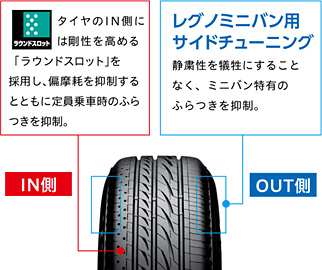 「REGNO GRVⅡ」は、滑らかな路面から荒れた路面まで"路面ごと"に異なる「気になりやすいノイズ」を低減する新技術を搭載しました。タイヤ踏面部の溝の中で発生したノイズを低減する「ダブルブランチ型消音器※2」や路面からの振動を抑え車内へのノイズの伝わりを抑制する「ノイズ吸収シートⅡ※2」により、従来品と比べ騒音を低減し※3優れた静粛性を実現しています。