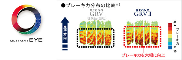 さらに、独自技術「アルティメット アイ※4」を駆使することで、ブレーキ時の力を計測し、その結果を基に踏面部のブロック剛性と排水性を最適化しています。これにより、従来品「GRV」と比べ、転がり抵抗を18%低減、ウェットブレーキ停止距離も14%短縮※2し、また優雅な乗り心地や高い操縦安定性を実現しています。