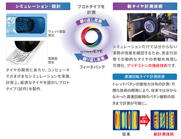 ULTIMAT EYE™は、タイヤの接地面挙動を計測・予測・可視化するブリヂストン独自のタイヤ開発技術です。従来のタイヤ開発は、シミュレーションを行い、試作品を作り、室内計測と実車テストを通じて性能確認を行うという流れで行われてきました。ULTIMAT EYETMは、実車と同等の高速走行状態を室内で再現し、タイヤ接地面における挙動を可視化することができます。これによって、従来の実車テストに加えて、科学的な根拠に基づく精度の高い解析や性能確認を行うことができ、タイヤの更なる性能の向上を図ることができます。なお、この計測・解析を行う試験機は、時速400km、バンク角60度まで対応可能です。