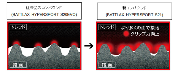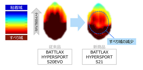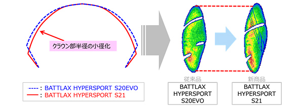 フロントタイヤのクラウン部を小径化することで、コーナリング時の車両を傾けた状態におけるタイヤ接地面が車両前後方向に長くなり、これによって車両を旋回させる力(キャンバースラスト)が増大し、従来品「BATTLAX HYPERSPORT S20EVO」対比でコーナリング性能の向上に貢献しています。