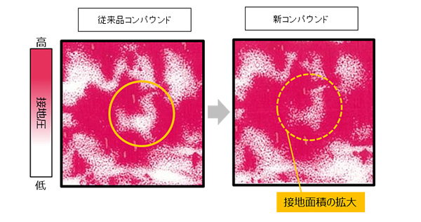 コンパウンド設計を分子レベルから見直し、ミクロレベルでのタイヤと路面の接地性を向上させた新コンパウンドを開発しました。この新コンパウンドを、コーナリング時に重要となる、フロント(3分割トレッド)及びリアタイヤ(5分割トレッド)※2のショルダー部分に採用し、コーナリング性能の向上に貢献しています。