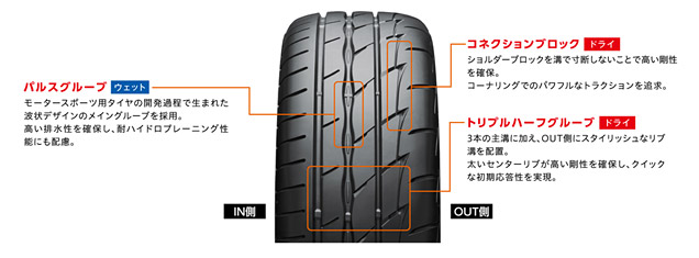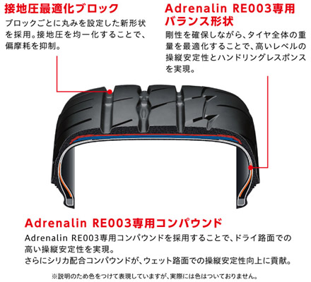 「Adrenalin RE003」はモータースポーツ用タイヤ開発で培った、高いブロック剛性と排水性の両立を図ったトレッドパタンを採用することで、高速走行時から通常の街乗りに至るまで軽快なハンドリング性能を発揮、お客様にスポーティーな走りを提供します。また乾いた路面のみならず、濡れた路面でのグリップ力も高度に追求したシリカ配合ゴムを採用、これにより雨の日のドライブもサポートします。