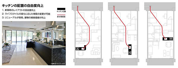 ※1 「スマートサイホン」とは、サイホンカ(水が落ちることで発生する引く力)を利用する新しい排水システム、サイホン排水システムのための商品です。当該商品を採用することで、マンションの床下空間を従来より低く設計でき、台所や浴室等の水回りの配置の自由度が向上します。