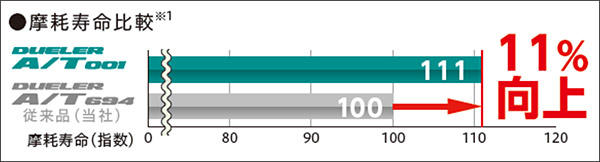 センターとショルダーのブロック幅を見直した「DUELER A/T 001」の「専用最適配置ブロック」により、トレッド部の剛性を最適化すること等で、耐摩耗性能を従来品(「DUELER A/T 694」)対比、11%向上しています。