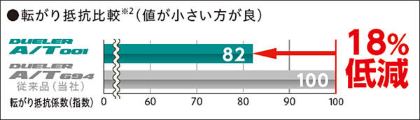 「ナノプロ・テック」を活用した新配合トレッドゴムを採用することで、転がり抵抗を従来品(「DUELER A/T 694」)対比、18%低減しています。