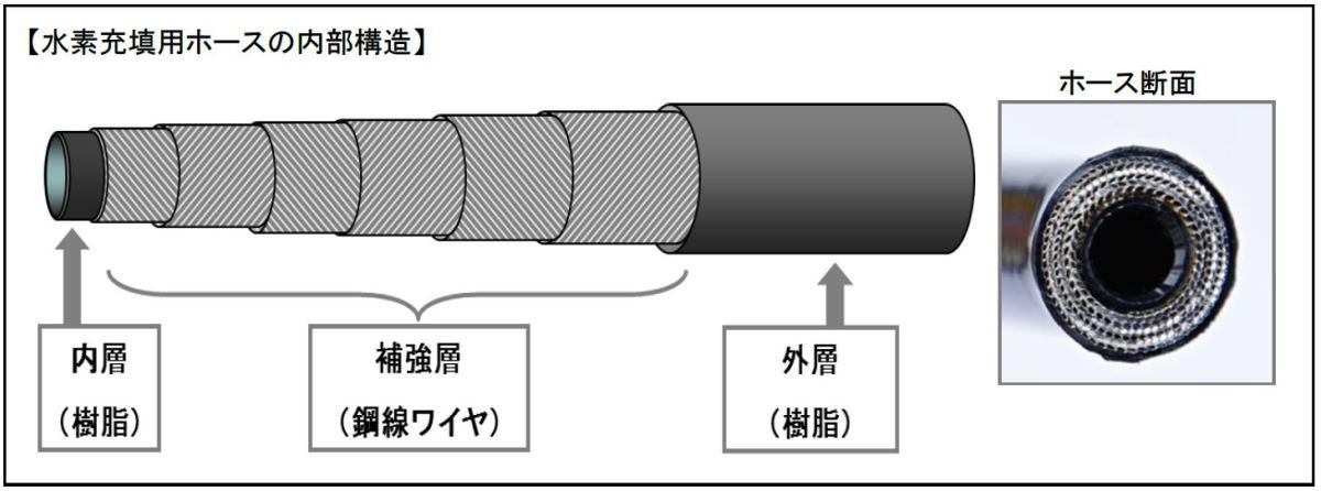 - (1)ホース内部の補強層に耐水素脆化性を追求した高抗張力鋼線ワイヤーを採用し、さらに6層にすることで高耐圧性を実現