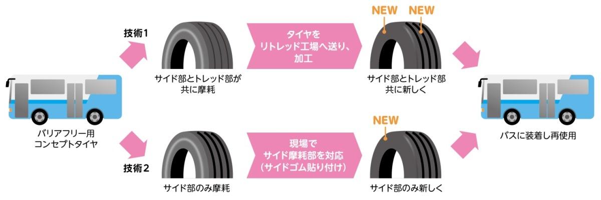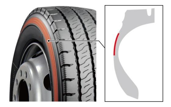 これらの技術を適用し、従来の摩耗対策(タイヤサイド部のゴムをあらかじめ厚くすること)に比べ、タイヤの重量増や転がり抵抗悪化を軽減できます。また摩耗した部分のみ交換する為、より省資源で、バス事業者様に対してタイヤを「より長く経済的に」ご使用頂くモデルのご提案が可能になります。