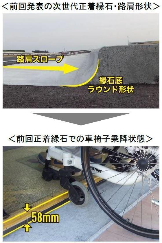 2016年12月に発表した「次世代正着縁石」は、適度に傾斜させた路肩スロープで、容易かつ安定して正着性を向上させつつ、縁石底ラウンド形状にてタイヤサイド部の摩耗を軽減するものでしたが、今回は新たに車両接触回避形状を導入することにより「次世代正着縁石」の段差を改善しました。具体的には、「次世代正着縁石」で58㎜あった段差を減少させ、かつ車体と縁石の接触を回避するために、縁石側に車両接触回避部を有する新たな縁石・路肩形状を考案しました。
