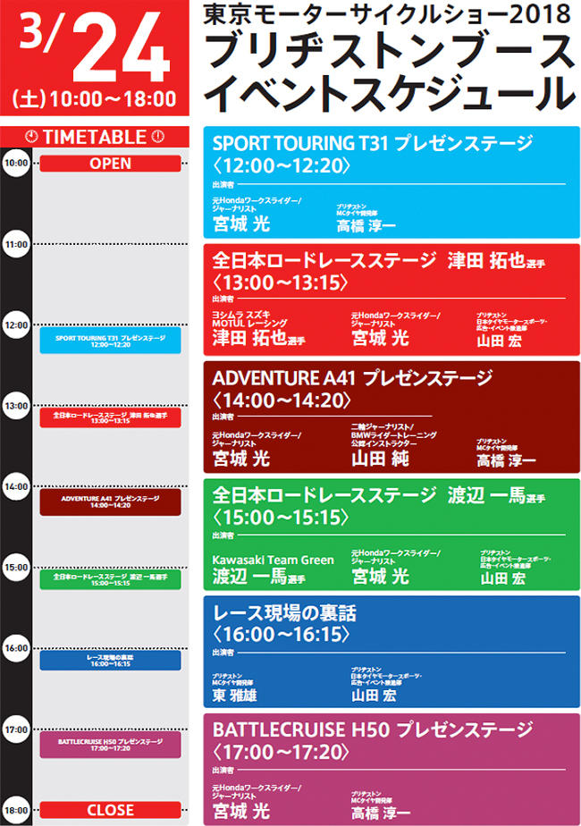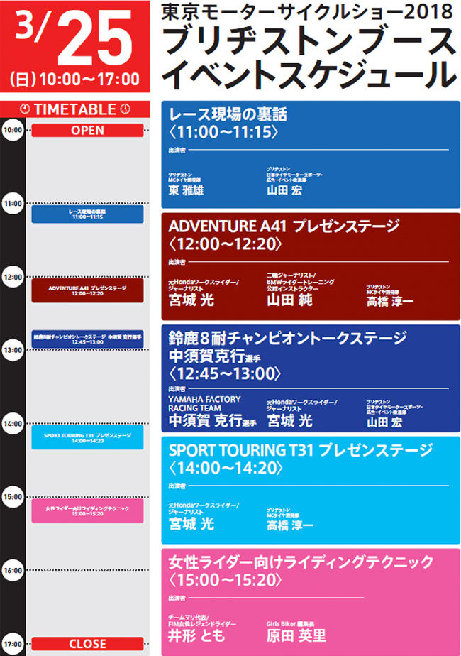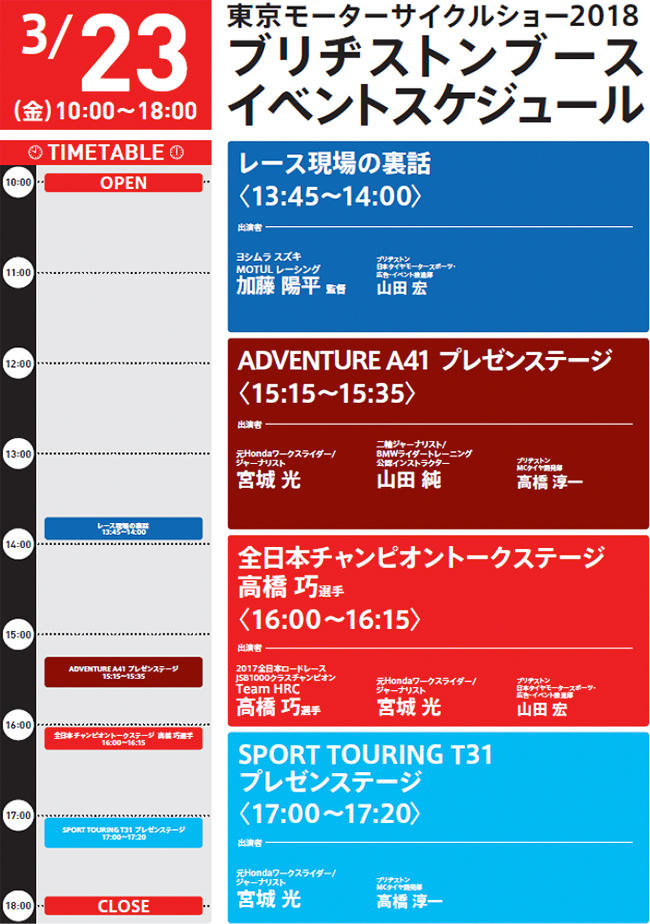当社ブースでは、誕生から35周年を迎えるBATTLAXブランドの新商品「BATTLAX SPORT TOURING T31」、「BATTLAX ADVENTURE A41」、「BATTLAX RACING R11」、「BATTLAX SCOOTER SC2」など、ツーリング、アドベンチャー、レース、スポーツといったお客様のバイクライフに合わせた商品展示を行います。それら商品を装着した車両や、当社タイヤを装着してFIM世界耐久選手権 鈴鹿8時間耐久ロードレースで優勝を飾った車両などを展示し、当該レース車両を含めて全ての展示車両に跨ることができます。また、特設ステージでは、バイクの様々な楽しみ方に応じたテーマ設定でトークショー※を予定しており、「BATTLAX」および「BATTLECRUISE」ブランドを通じて、多様なバイクライフを提案し、情報を発信していきます。